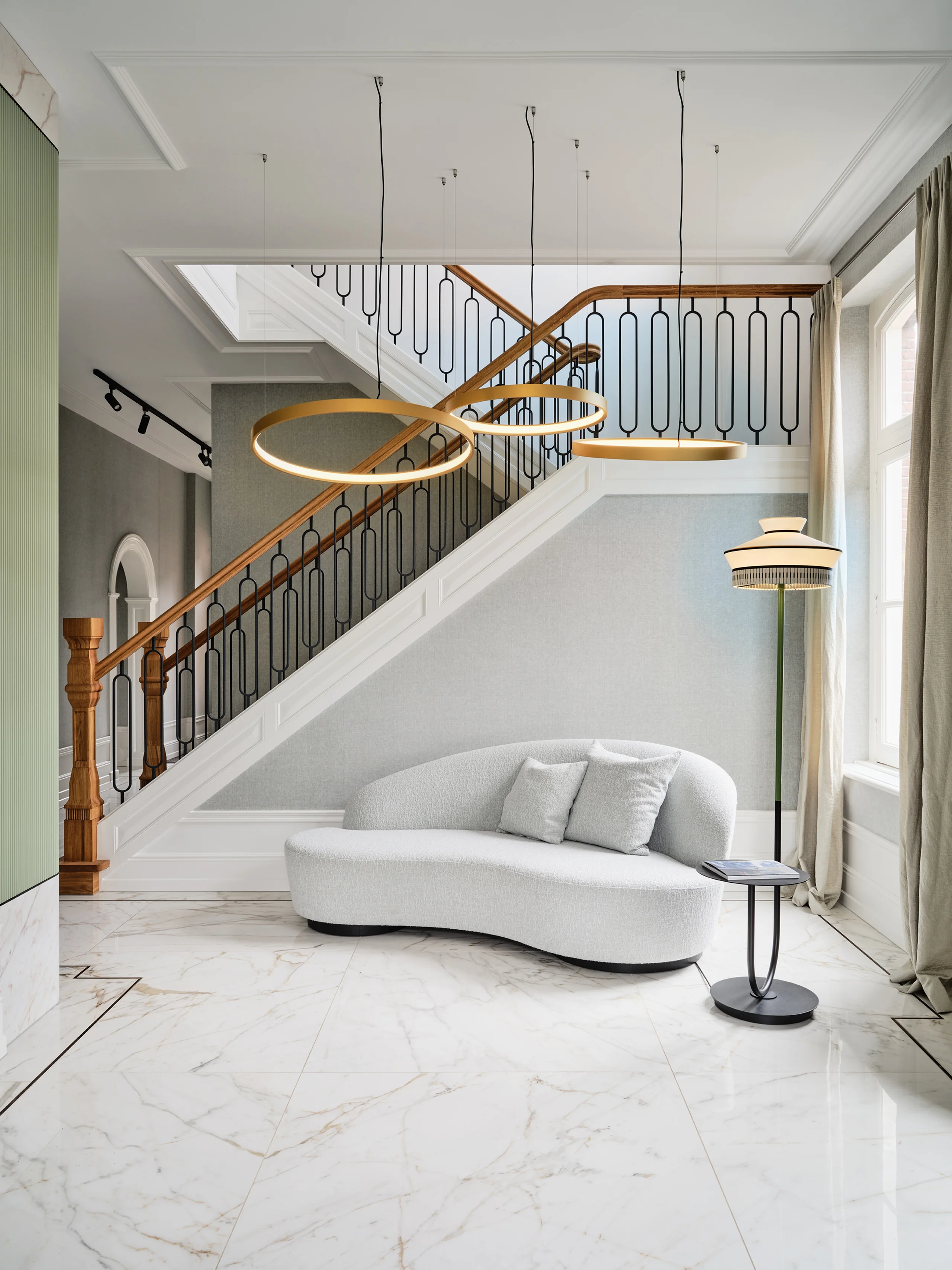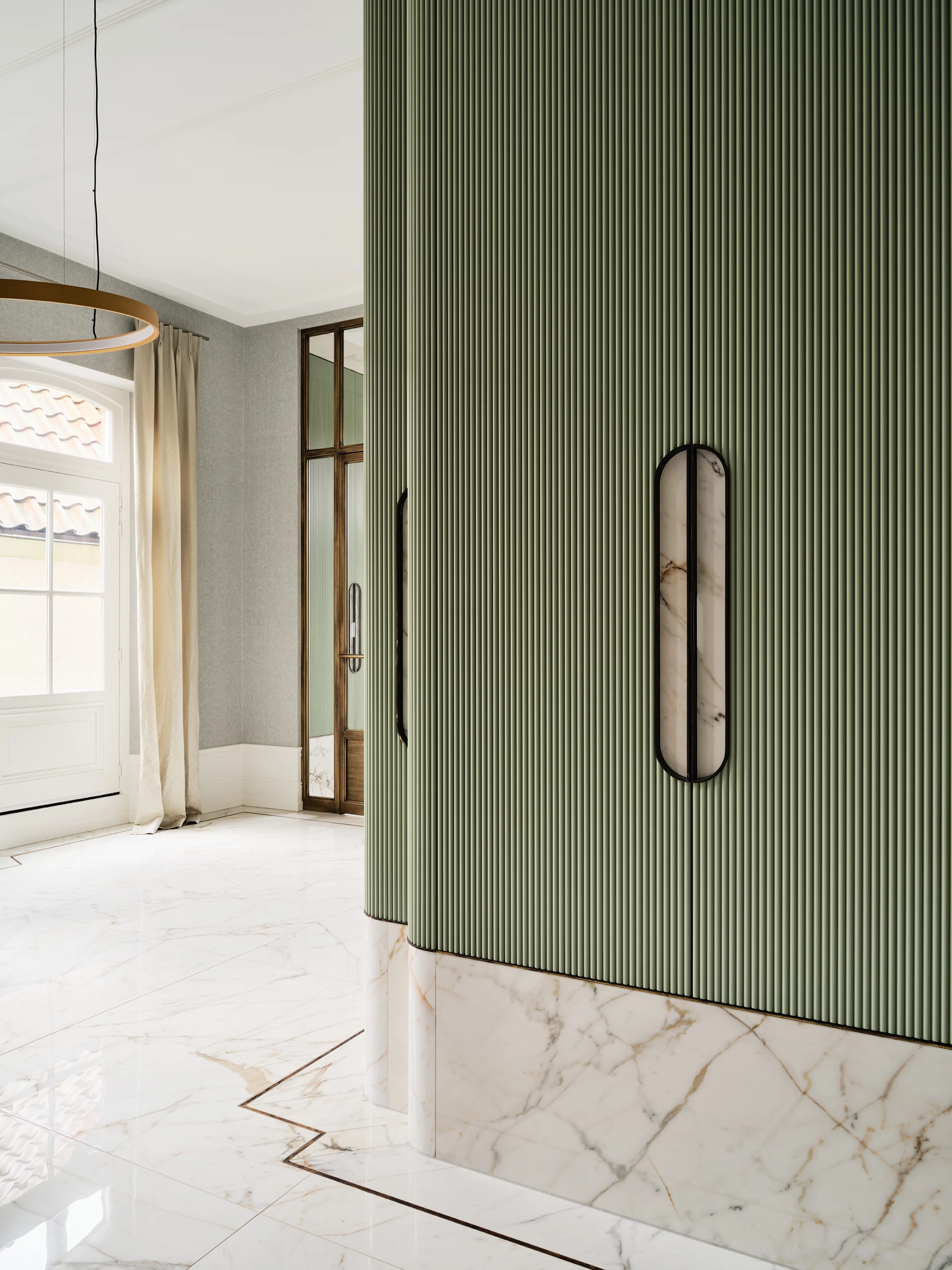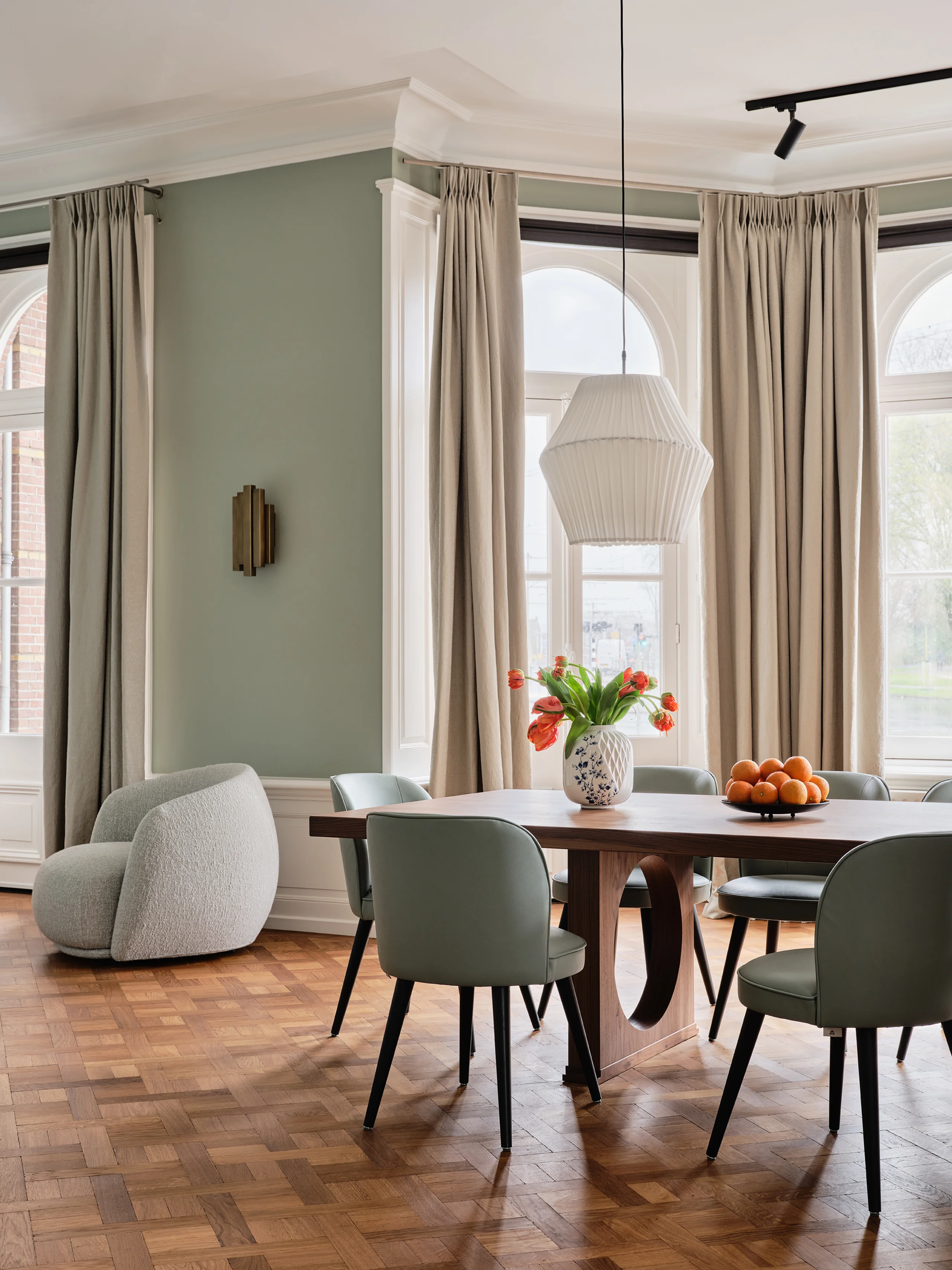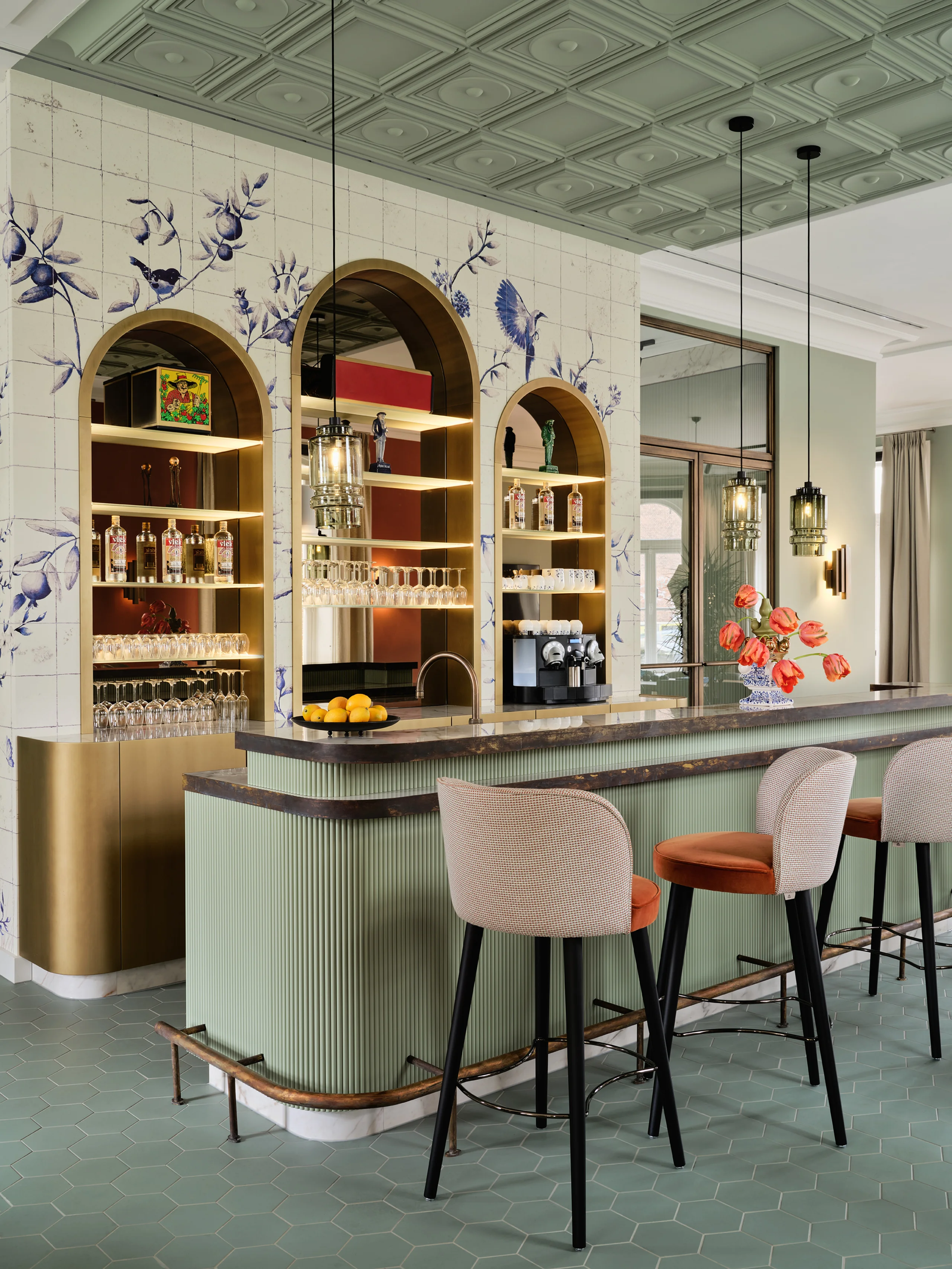 The concept of the design was ’quiet history‘, expressed through an aptly chosen colour palette of Delft Blue, a beautiful pale to mid-shade blue with the slightest pink undertones, and muted sage green. Colours that are calm, elegant, and deeply rooted in the heritage of Delft. In the lounge and bar, warm orange accents and Delft Blue tiles bring a lively, inviting energy. Every detail reflects meticulous attention, from the rounded edges of the custom furniture to the intricate brass linework in the restrooms. Acoustics and technology are ingeniously integrated without compromising the listed building’s character. Glass doors with aged brass fittings and a new staircase with a runner create a grand entrance.