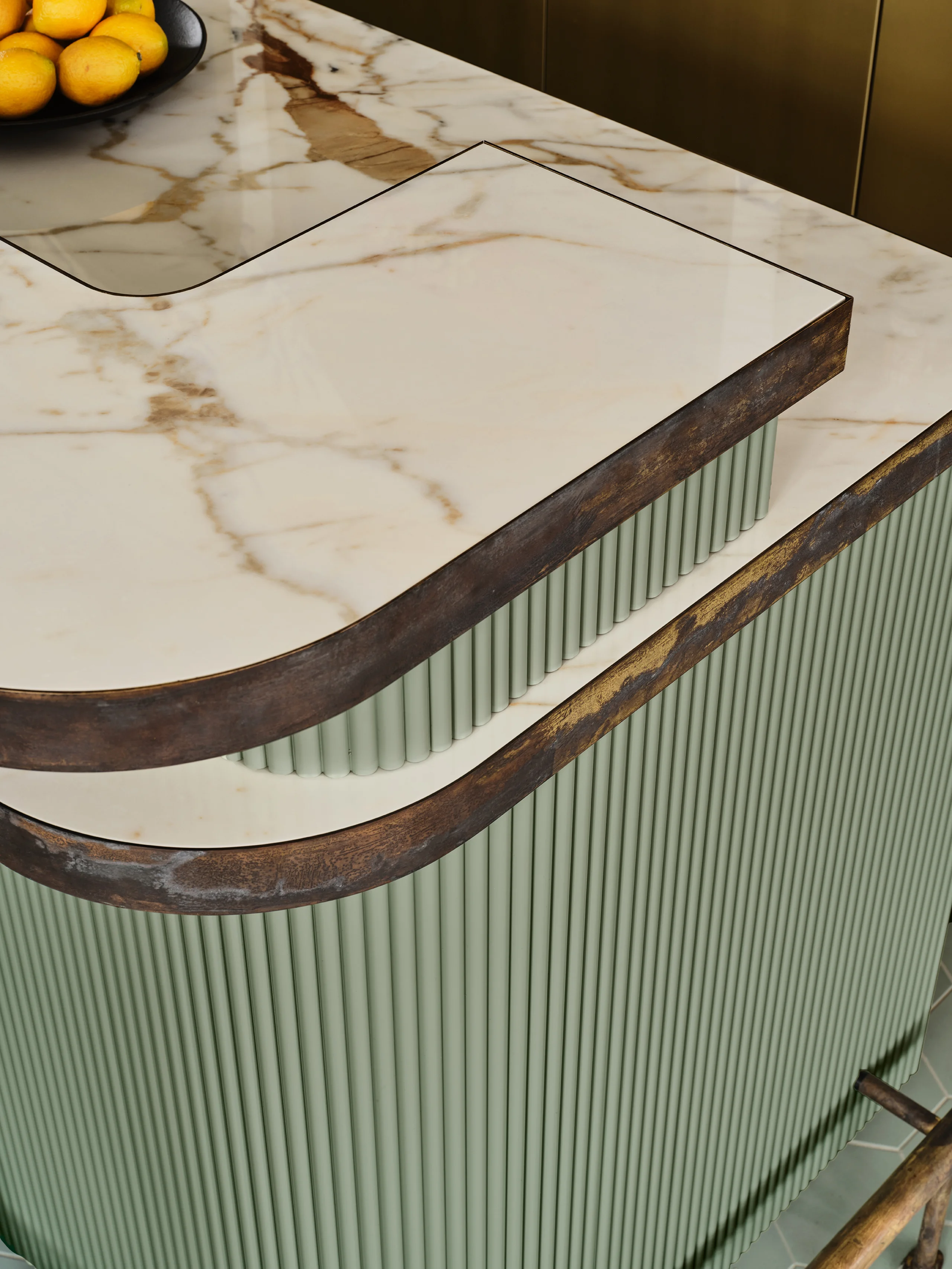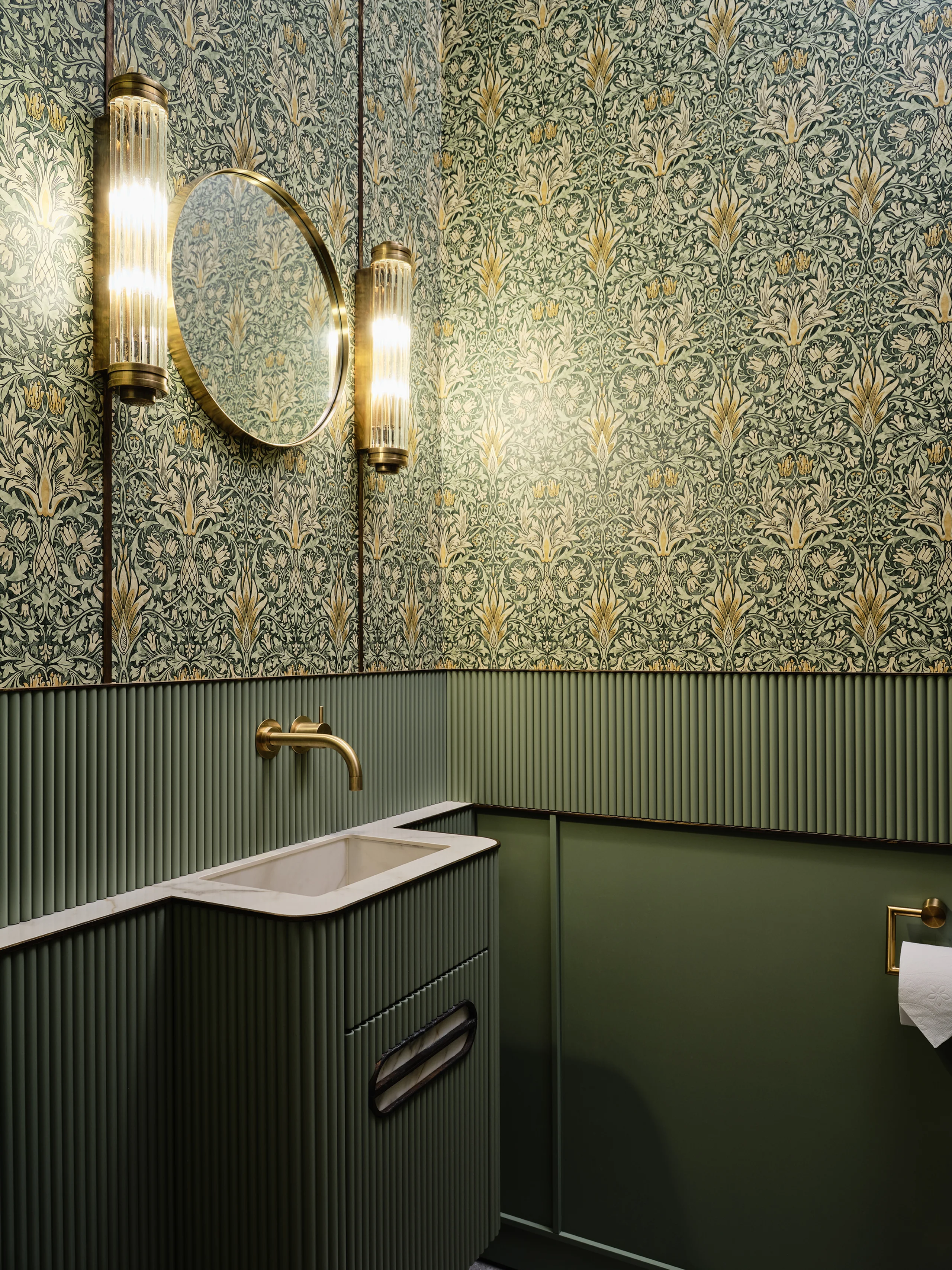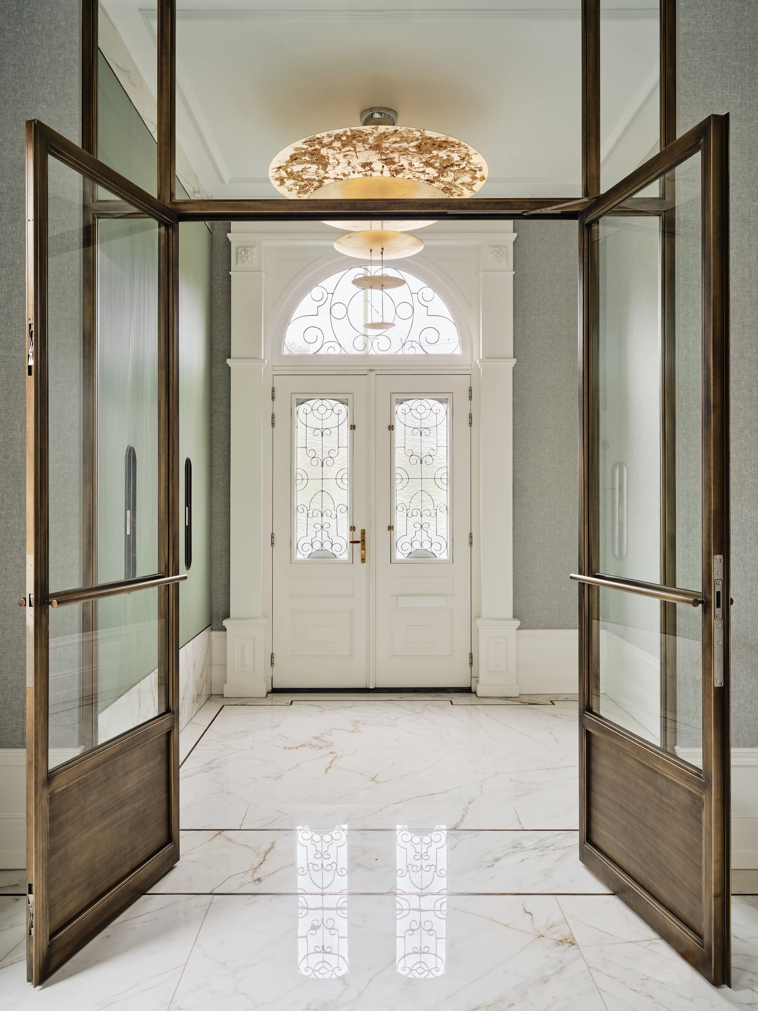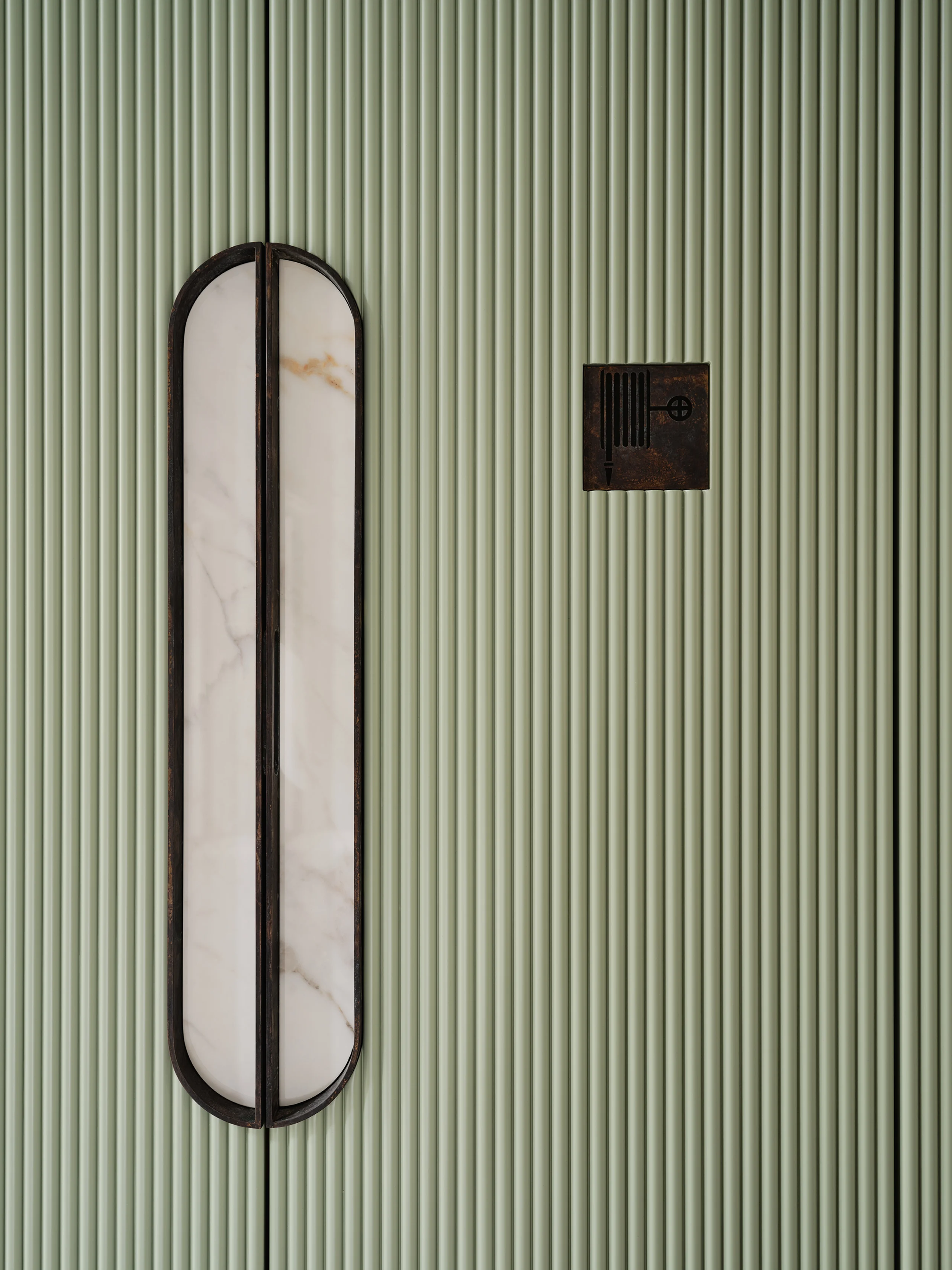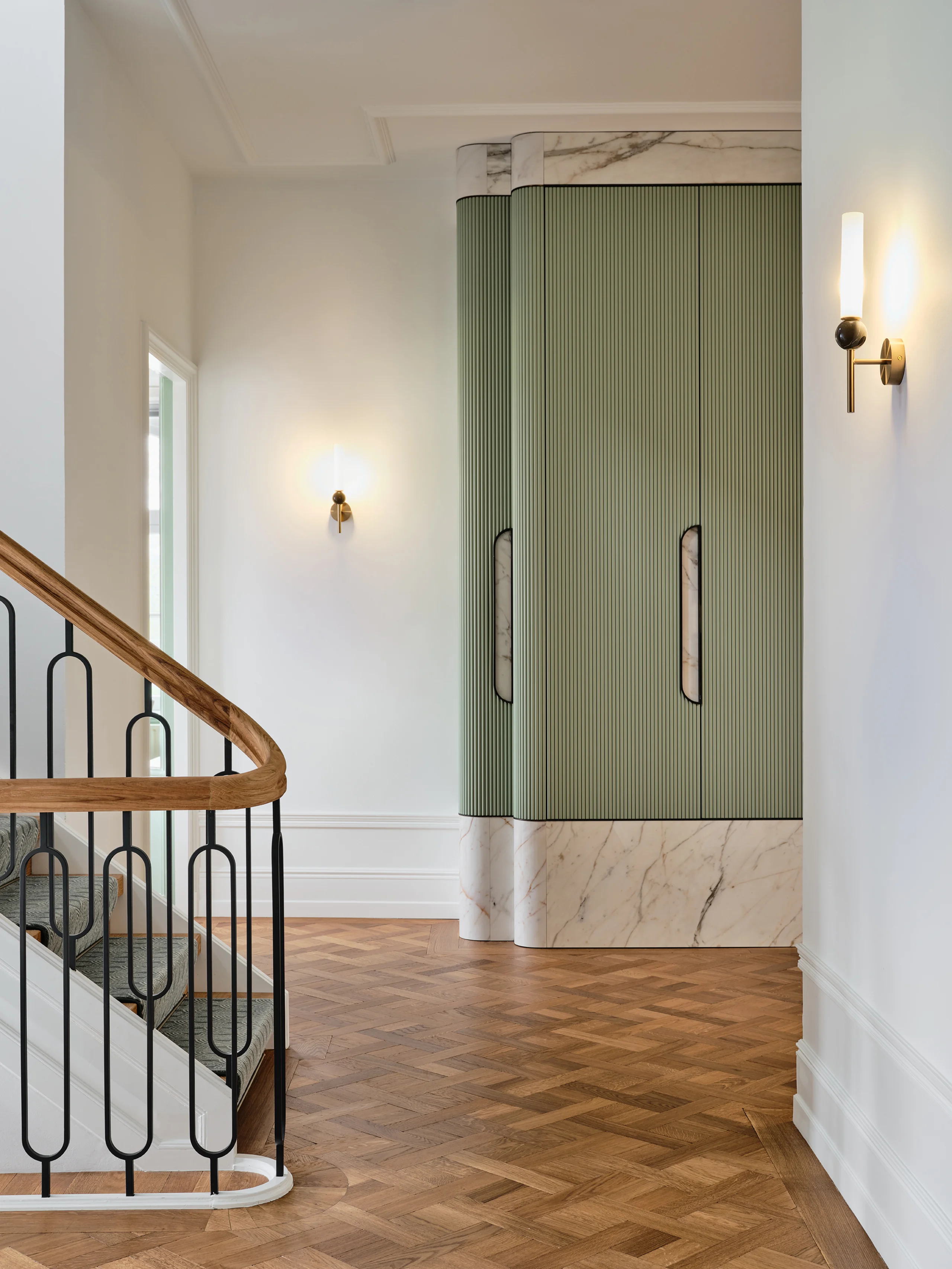 The concept of the design was ’quiet history‘, expressed through an aptly chosen colour palette of Delft Blue, a beautiful pale to mid-shade blue with the slightest pink undertones, and muted sage green. Colours that are calm, elegant, and deeply rooted in the heritage of Delft. In the lounge and bar, warm orange accents and Delft Blue tiles bring a lively, inviting energy. Every detail reflects meticulous attention, from the rounded edges of the custom furniture to the intricate brass linework in the restrooms. Acoustics and technology are ingeniously integrated without compromising the listed building’s character. Glass doors with aged brass fittings and a new staircase with a runner create a grand entrance.