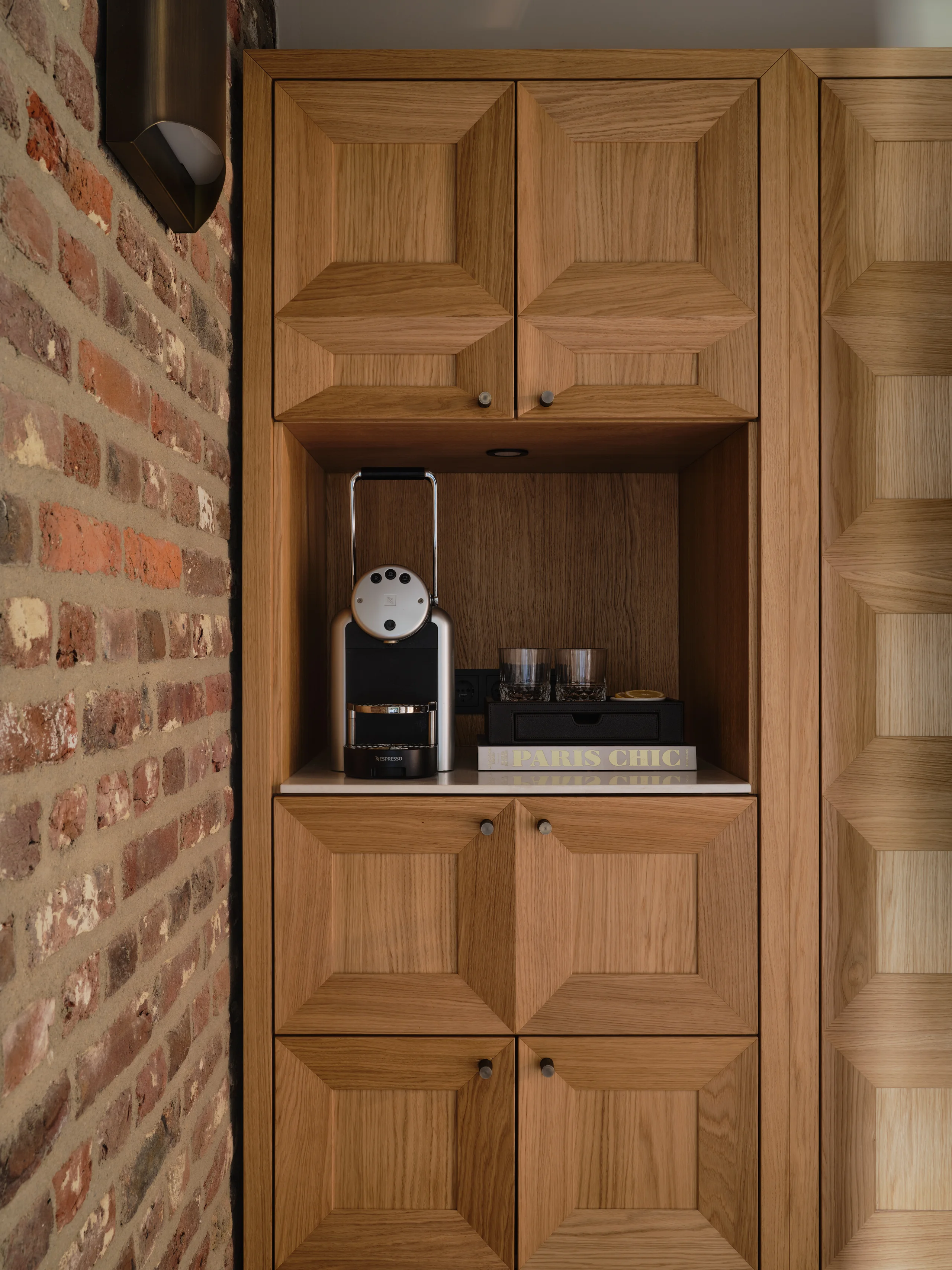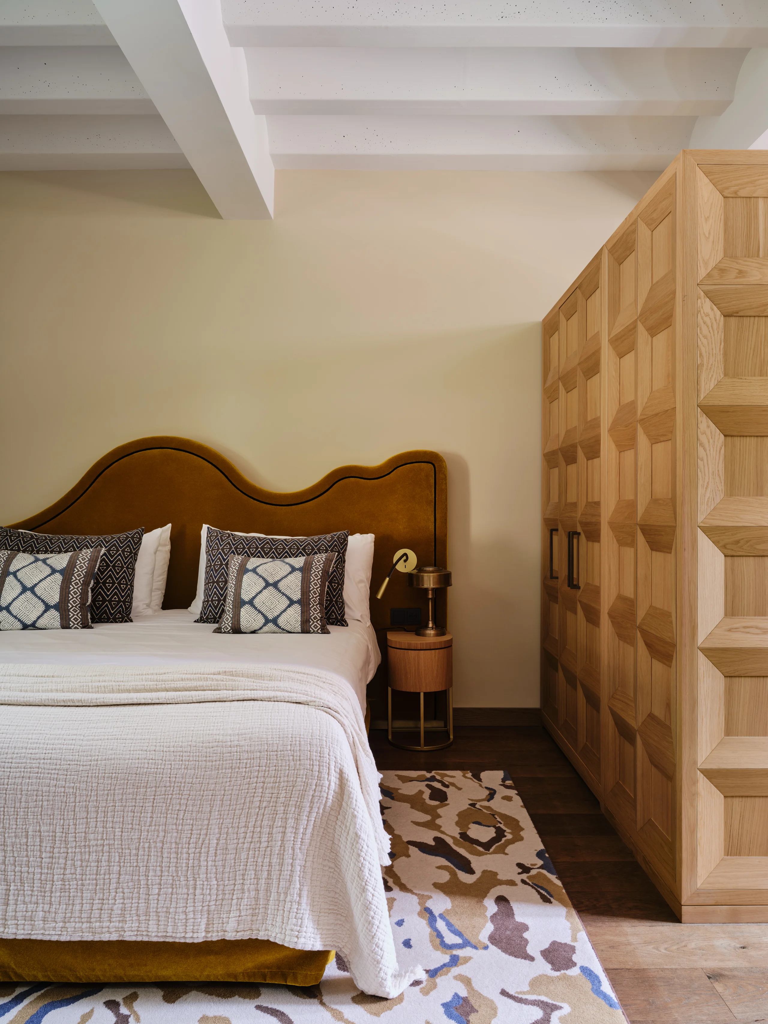 The design is inspired by the rolling landscape of the valley, most evidently in the curvilinear shapes of the headboards. The flowing forms are paired with the contrasting geometric shapes of the custom-designed millwork, transforming cabinets into sculptural objects. The faceted design is a playful reference to the historical covered ceilings, a classic architectural detail. Combining the two brings a harmonious contrast to the space, adding spaciousness and a sense of the unexpected.