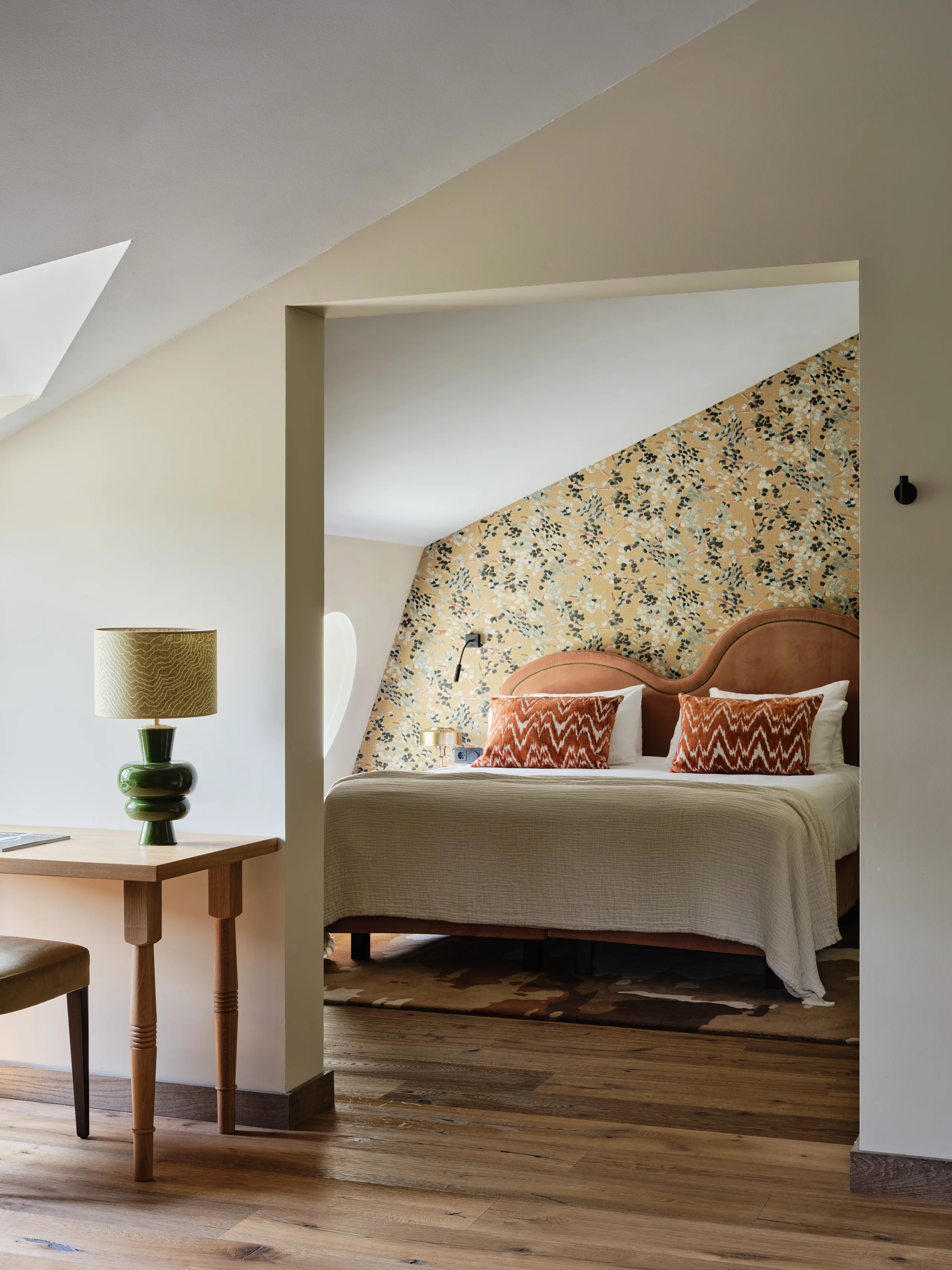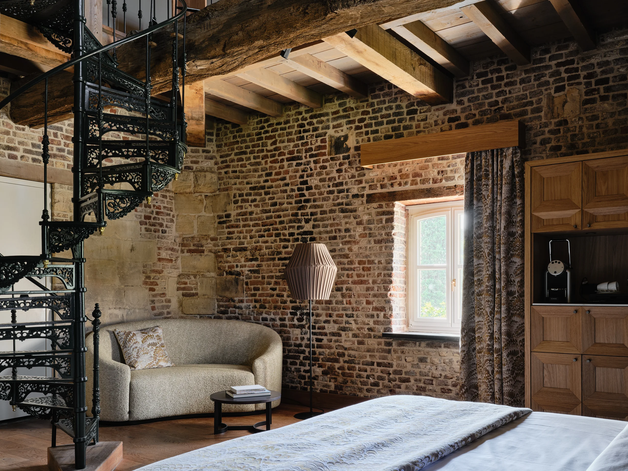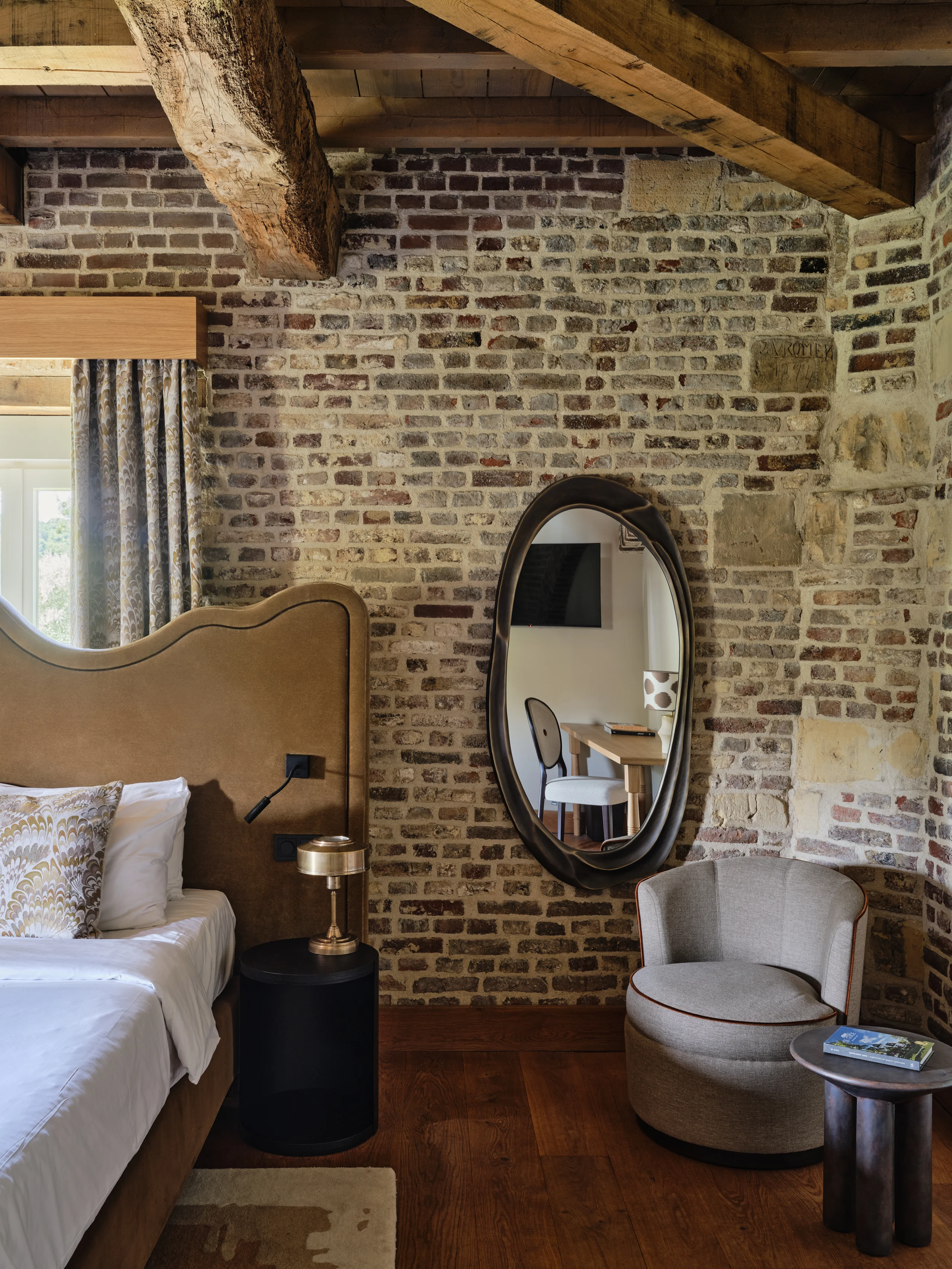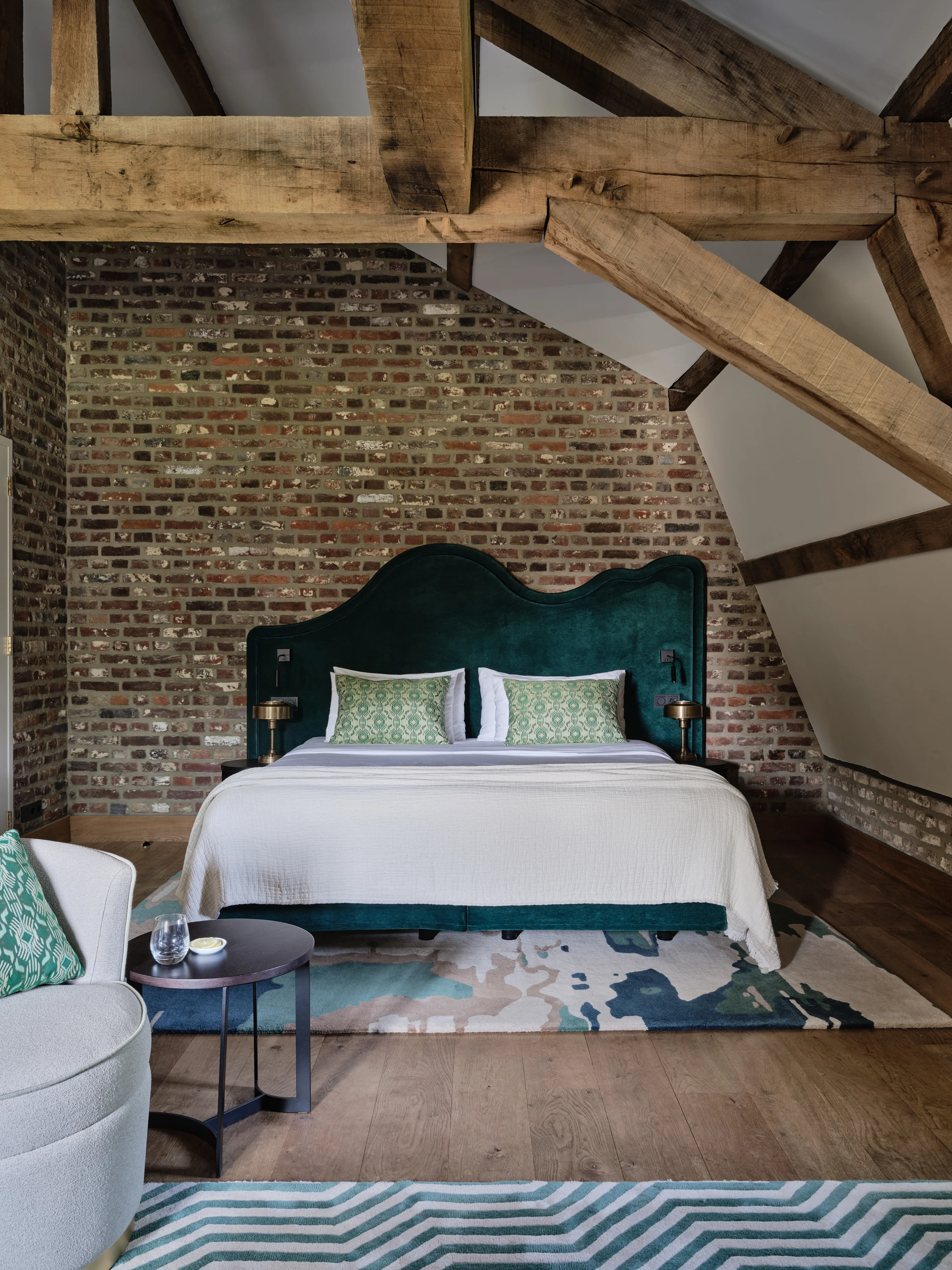 The entire design scheme consists of five main colour concepts. Atmosphere and authenticity are exemplified by exposed old beam constructions, rough brick walls, or original marlstone walls etched with names and symbols; the walls whisper stories from the past. This apparent roughness brings out the best in the soft textures and plant-inspired patterns, from the whimsical carpets to the colourful cushions.