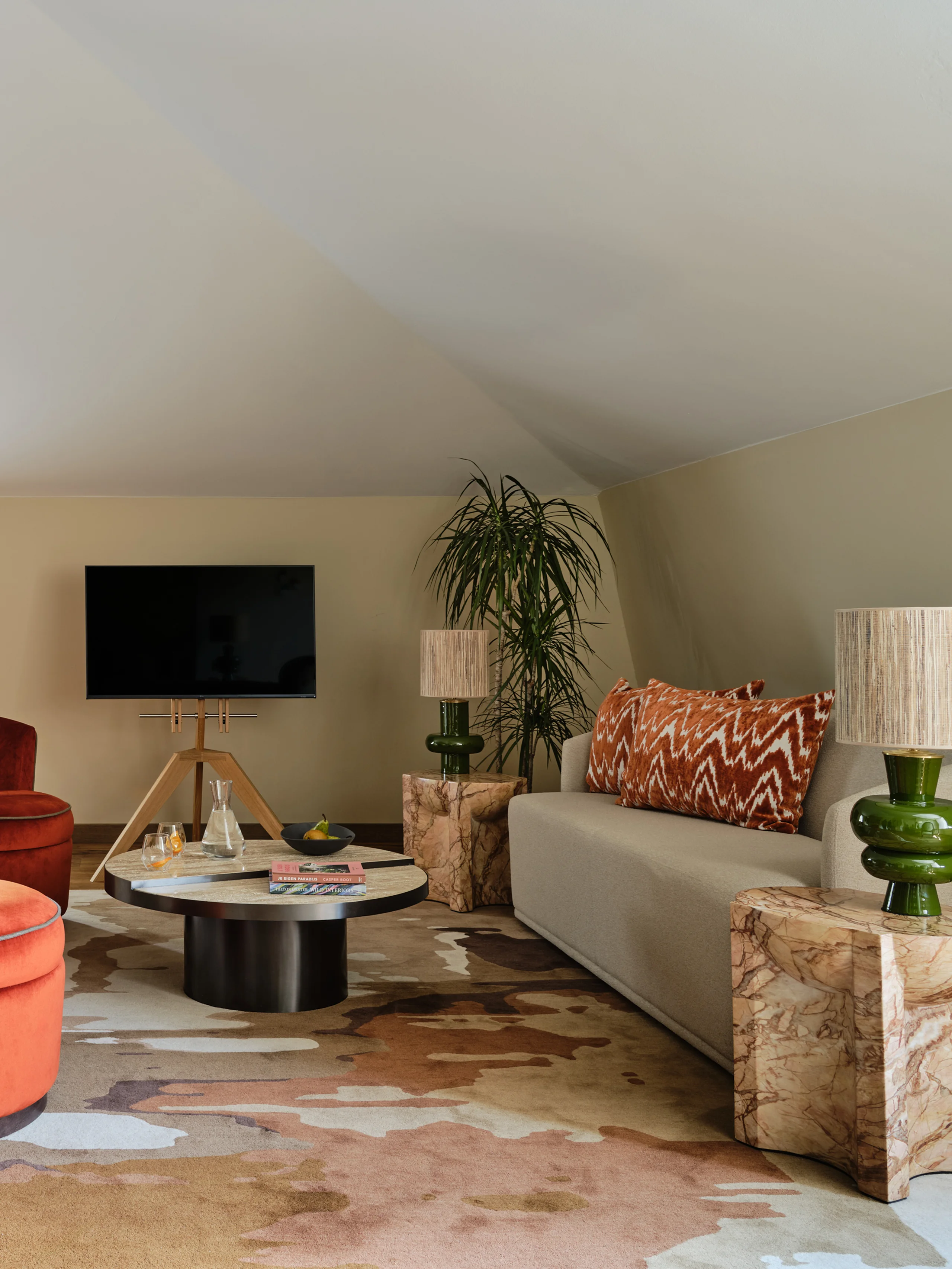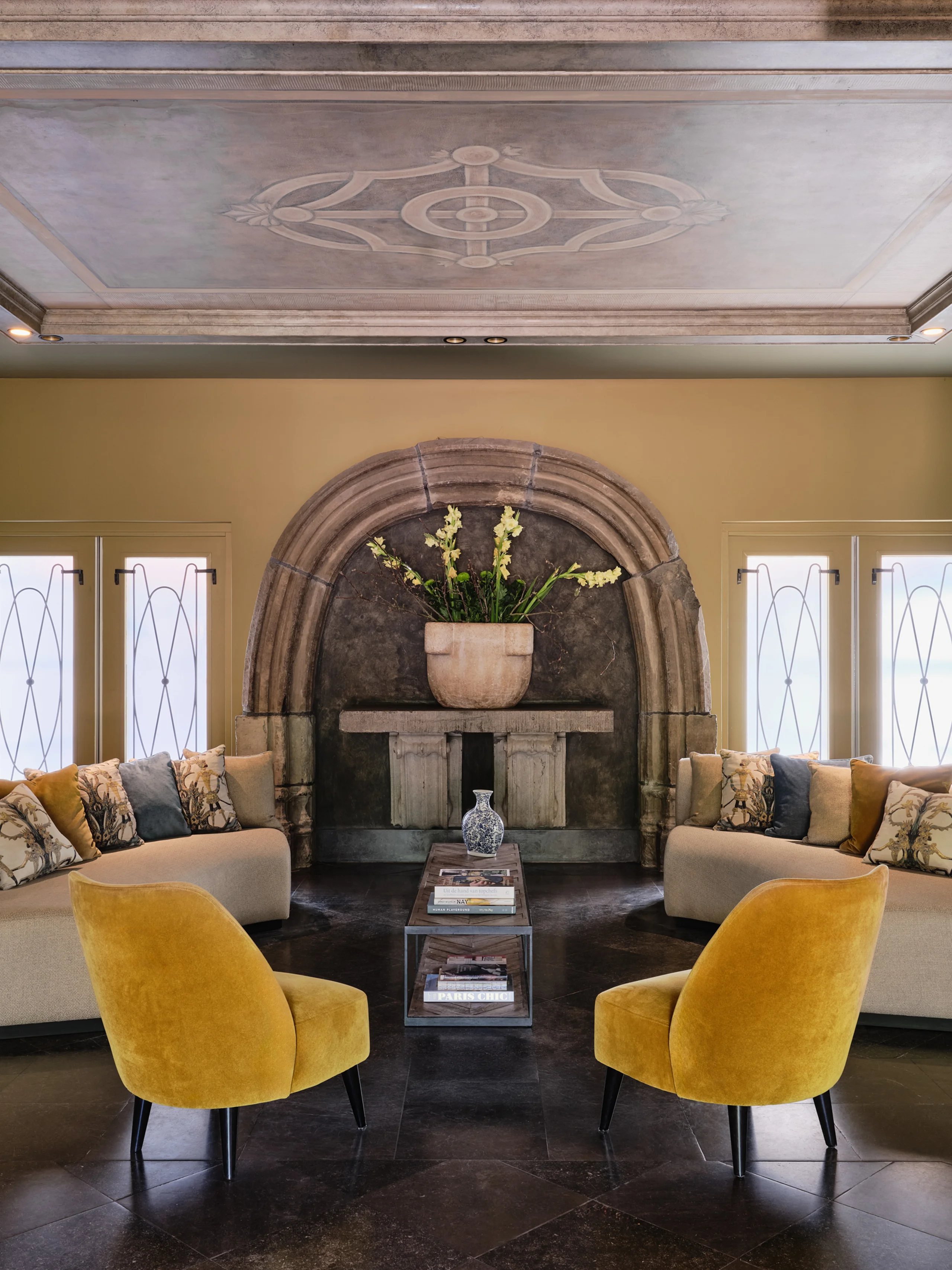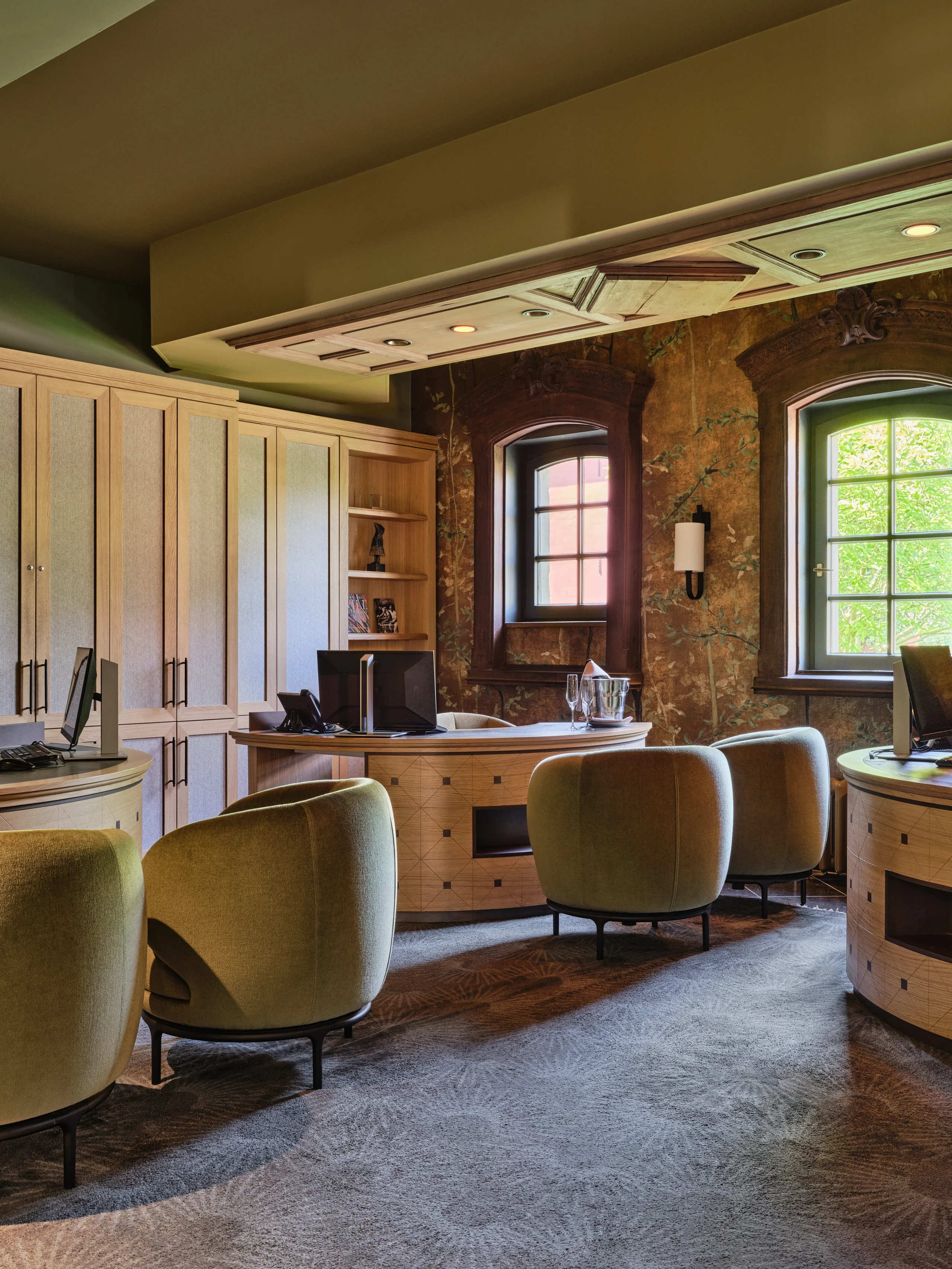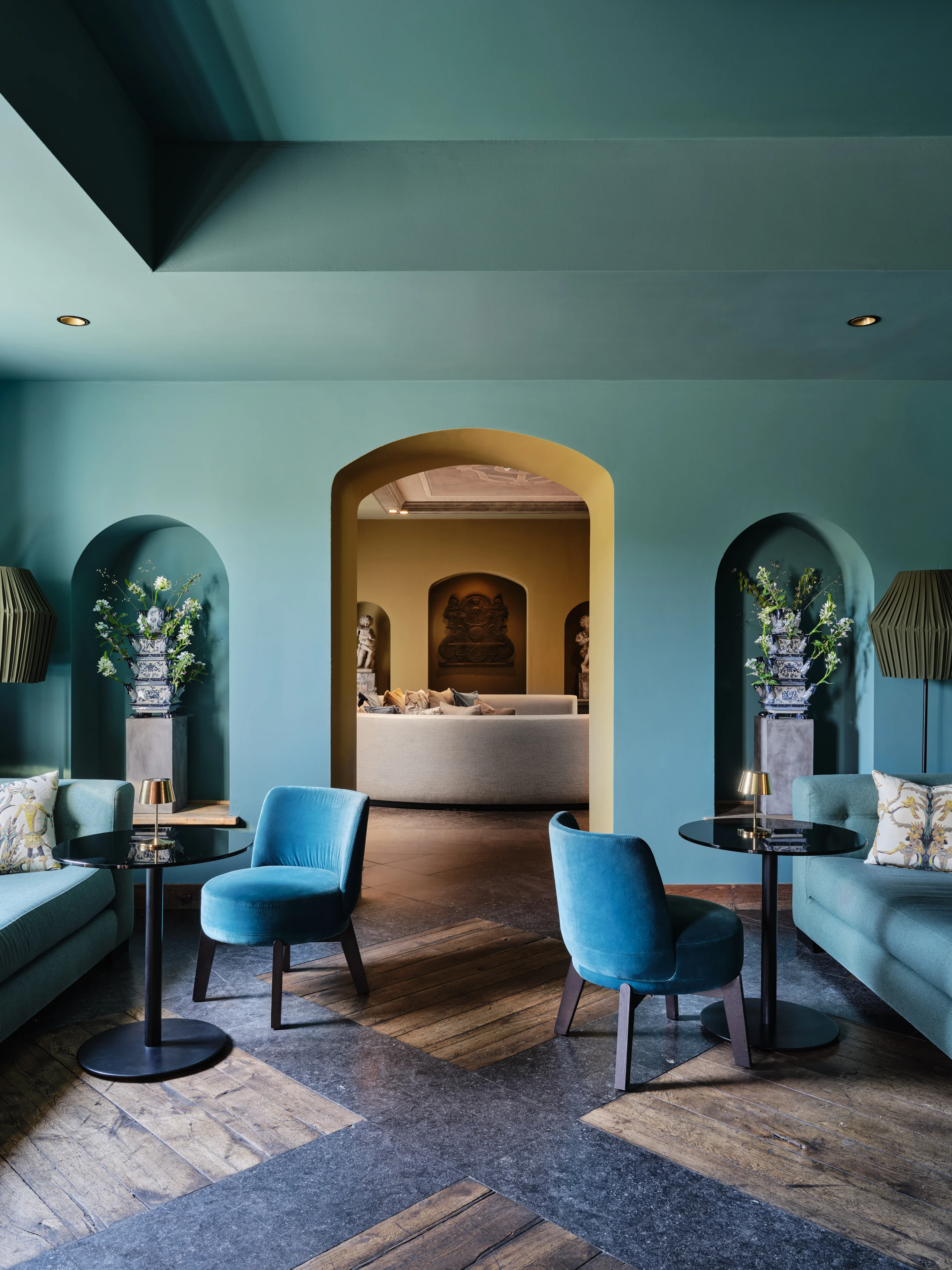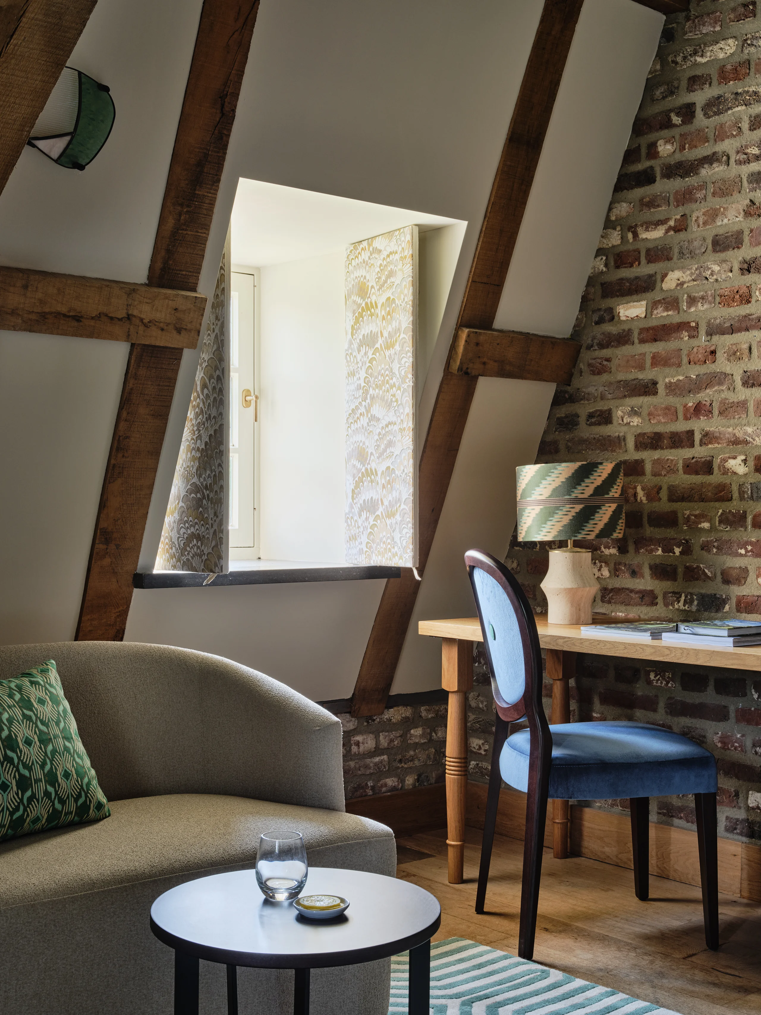 The entire design scheme consists of five main colour concepts. Atmosphere and authenticity are exemplified by exposed old beam constructions, rough brick walls, or original marlstone walls etched with names and symbols; the walls whisper stories from the past. This apparent roughness brings out the best in the soft textures and plant-inspired patterns, from the whimsical carpets to the colourful cushions.